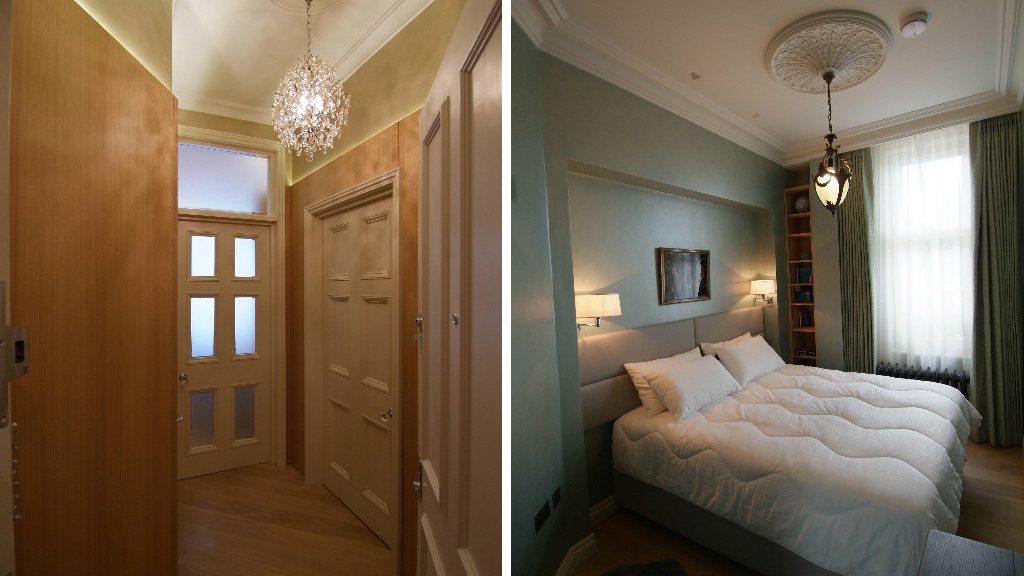 Step into the sitting room and feel your toes against the plush, red rug which lies before the large double sofa (it folds into a sofa bed for guests). Recline and admire the rose bouquet which sits on the fireplace, or the red brocade curtain drapes. Find the lever along the wood panelled wall until it slides to reveal a hidden kitchen, complete with super-slick chrome fixtures and modern appliances.
