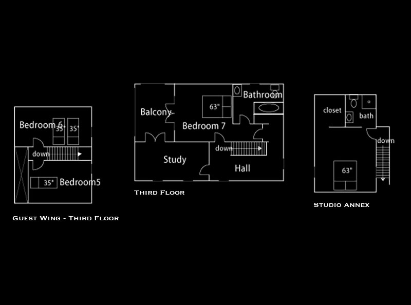 • Bedrooms and bathrooms: Sleeps a maximum of 10 adults and 3 children or young people in 8 bedrooms with 5 bathrooms. Master Bedroom 1 (Queen, 63″) with dressing room and en suite bathroom (double sinks, tub, separate shower); bedroom 2 (Double, 55″) with private bathroom (tub); bedroom 3 (Queen, 63″), bedroom 4 (Twins, 35″, can be combined as a King), and upstairs childrens rooms under the eaves: bedroom 5 (Single, 35″) & bedroom 6 (Twins, 35″), all sharing one bathroom (tub). Third floor: bedroom 7 (Queen, 63″) with private balcony, en suite bathroom (tub), and adjacent study. In studio annex across courtyard, bedroom 8 (Queen, 63″) with kitchenette, sitting area & en suite bathroom (shower). Toiletries by Molton Brown London.